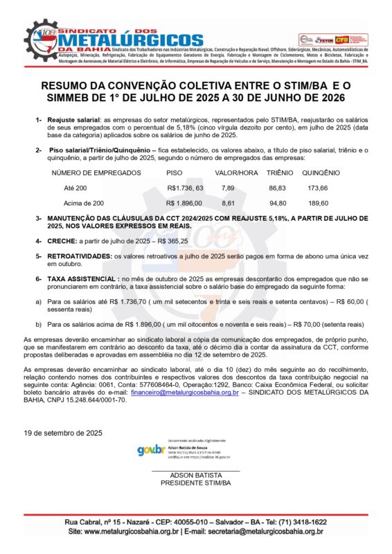 RESUMO DA CONVENÇÃO COLETIVA ENTRE O STIM/BA E O SIMMEB DE 1° DE JULHO DE 2025 A 30 DE JUNHO DE 202620 de setembro de 2025|Em Destaque, Convenções Coletivas|Por Sindicato PrevNext